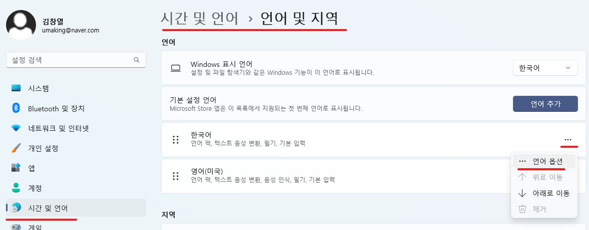 - 클릭으로 이동 '시간 및 언어 > 언어 및 지역'