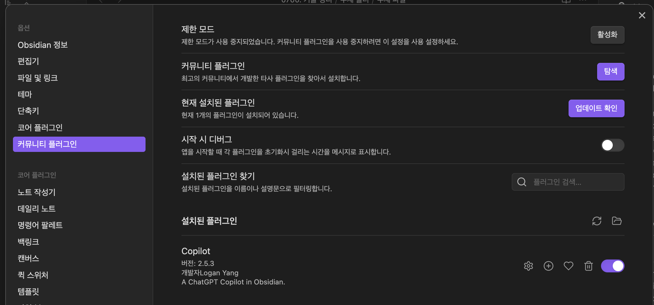 커뮤니티 플러그인 사용을 활성화 화여 'Copilot'을 사용/활성화 한다.
