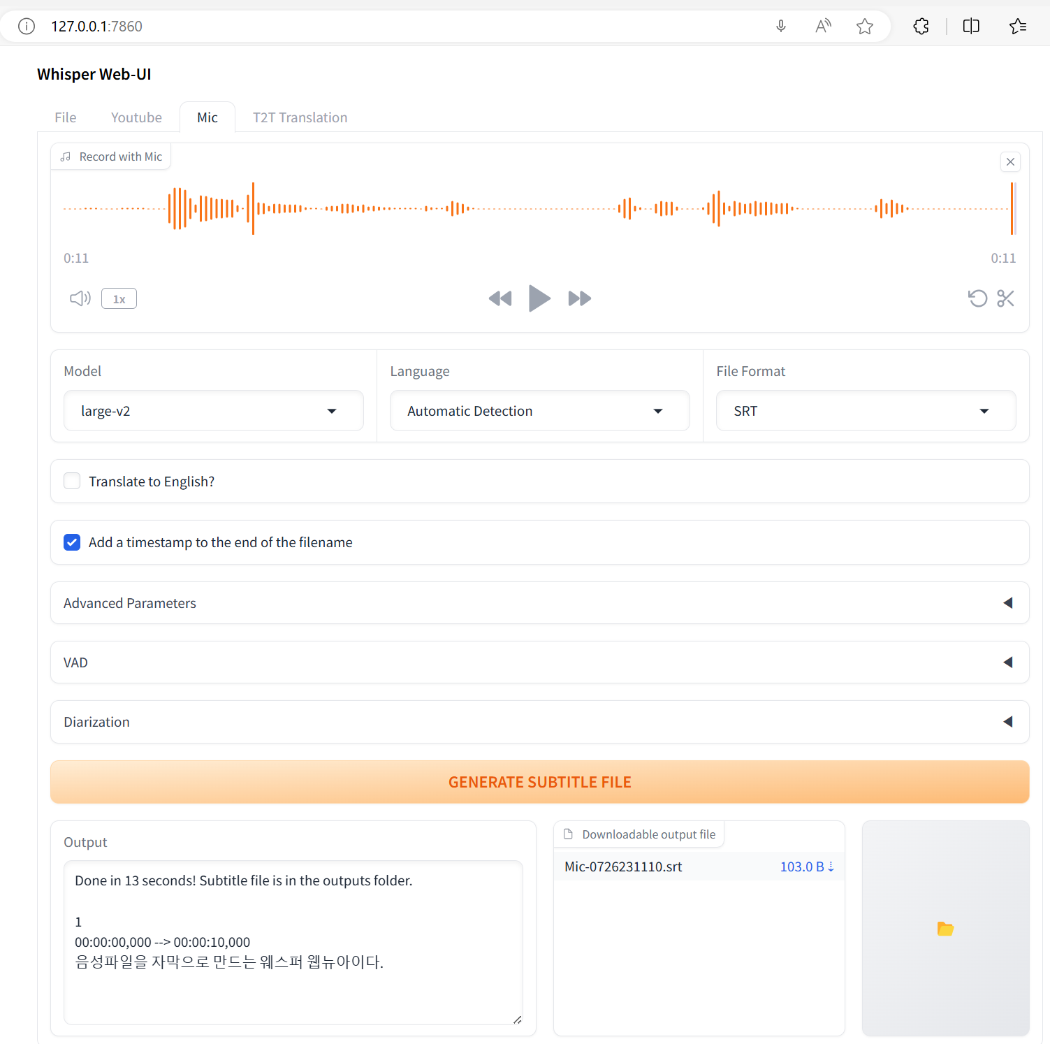 youtube 영상, 녹음 음성등 테스트 해봤으며, 정상적으로 자막 파일이 생성되었다.