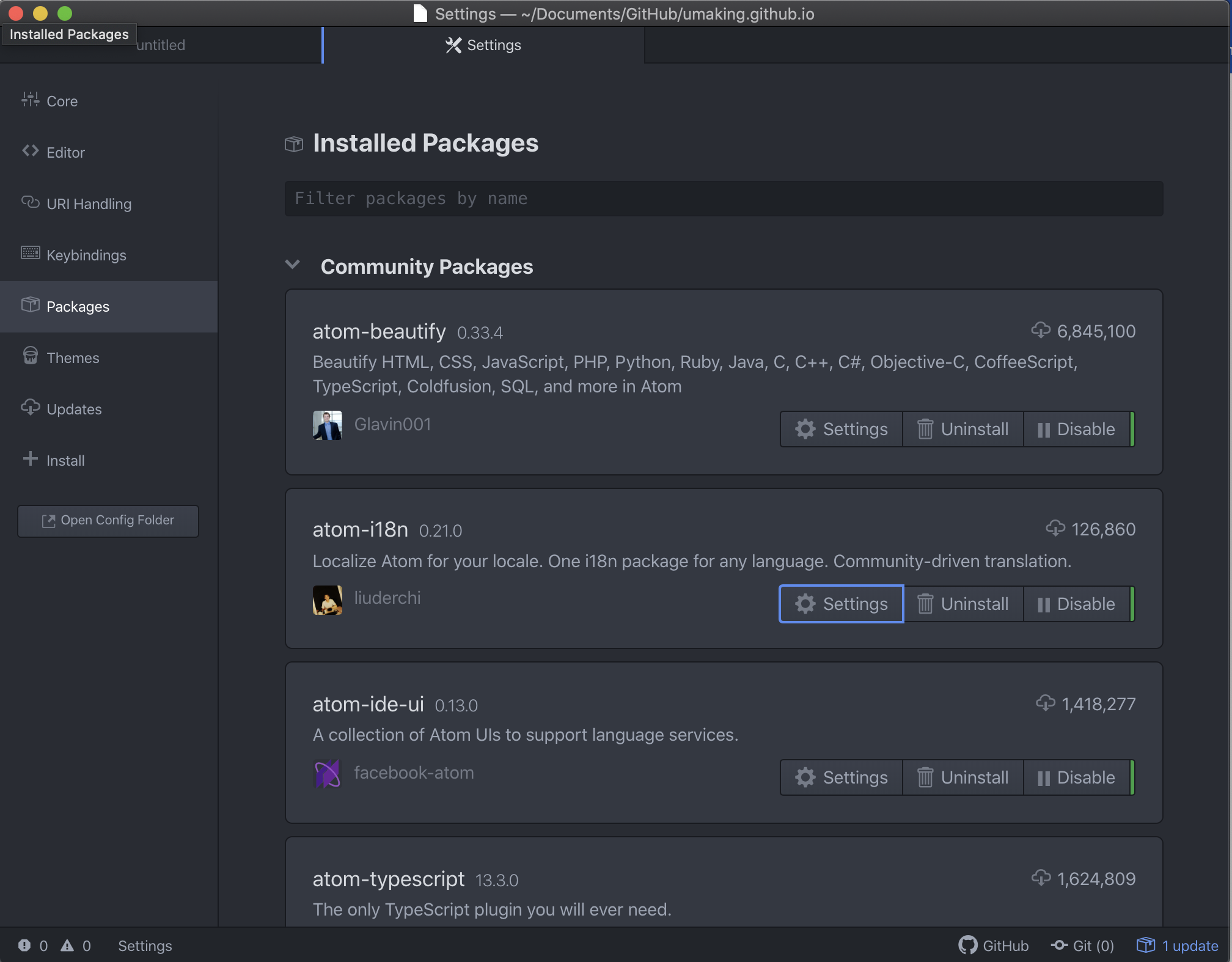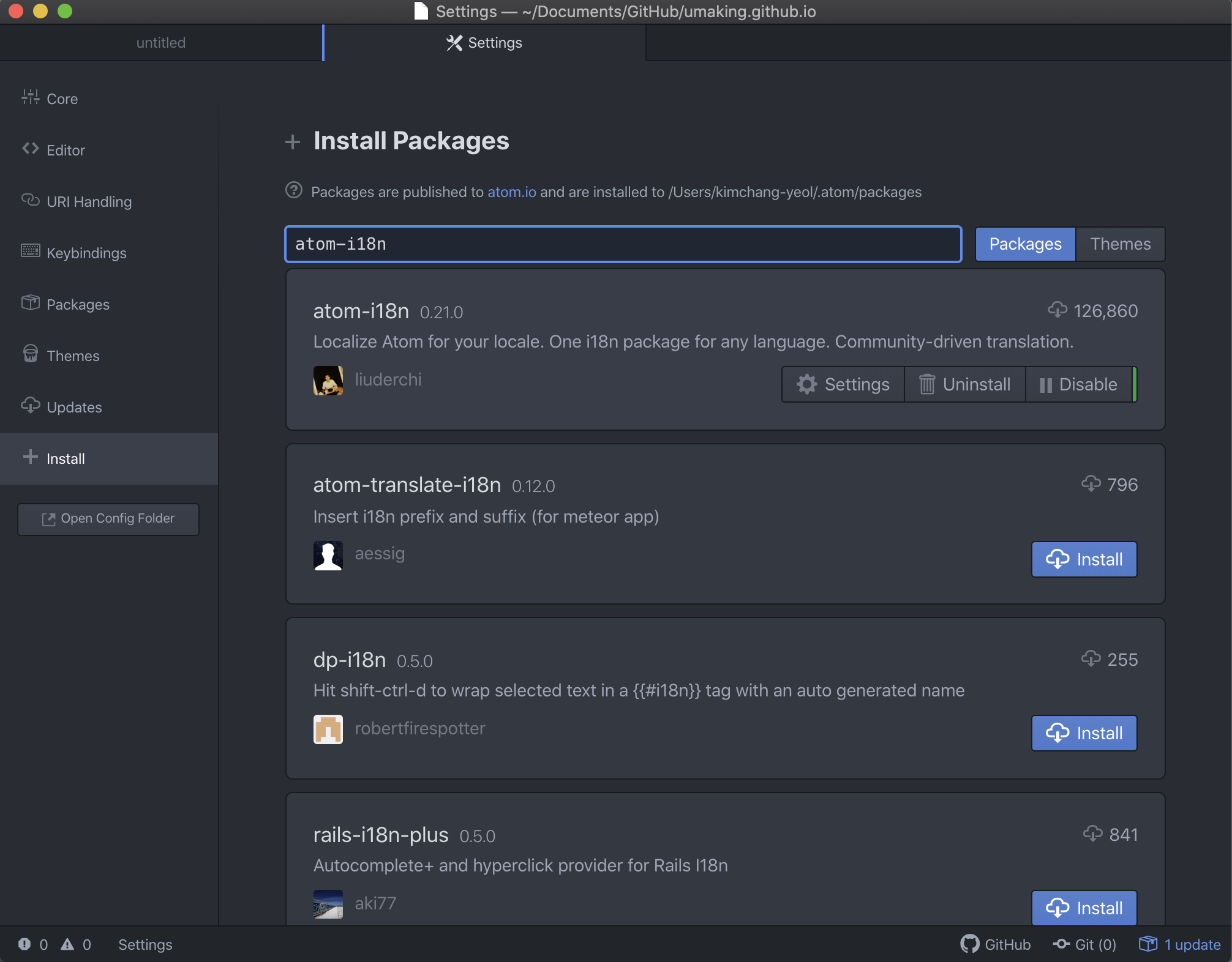 2. packge에서 'atom-i18n' 검색 후 install 클릭하여 설치
